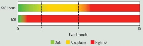 Unlike a soft tissue injury where it is deemed acceptable for an individual to experience a low level of pain (e.g. 0-3/10) whilst running, when managing BSIs there MUST be zero pain during a run, after a run and the following day. Image from Warden, Edwards & Willey (2021).