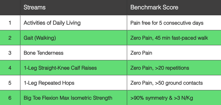 The bottom line is that passing your specific 'return to sport criteria' is the safest and most effective way to ensure a successful return to sport. Skipping phases or performing exercises sub-optimally will likely lead to issues arising when you start to run again. In order to offer context, the subsequent criteria (see table below) provides an example of the evaluation parameters utilised to determine an individual's eligibility to resume straight-line running following a bone stress injury.